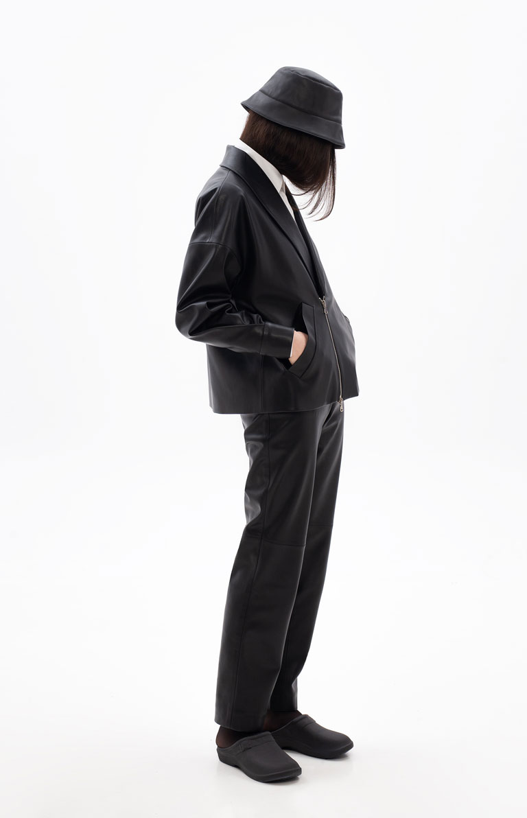 The Black Eco Jacket features a classic silhouette, crafted 100% from eco-leather. The Jacket is designed with a half zip at the front with a branded zipper puller and welt pockets. The shawl-shaped collar gives this jacket a classic yet modern look. The sleeves are designed with a fold sewn at the wrists to add volume and sophisticated draping on the sides.