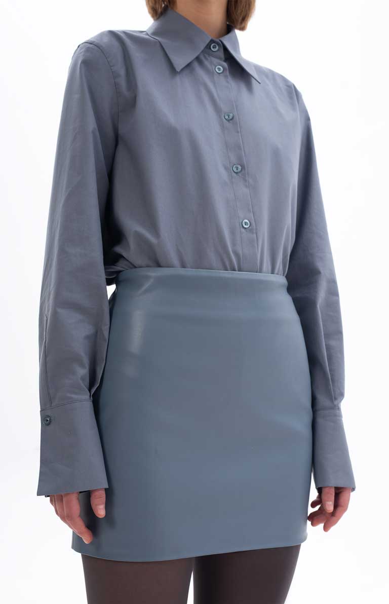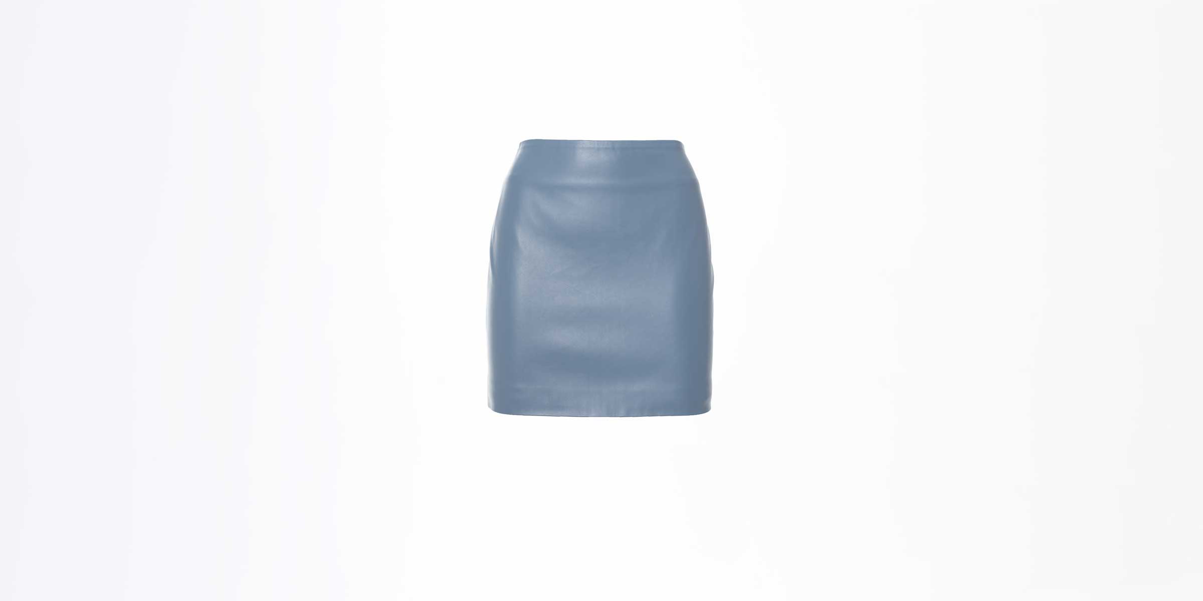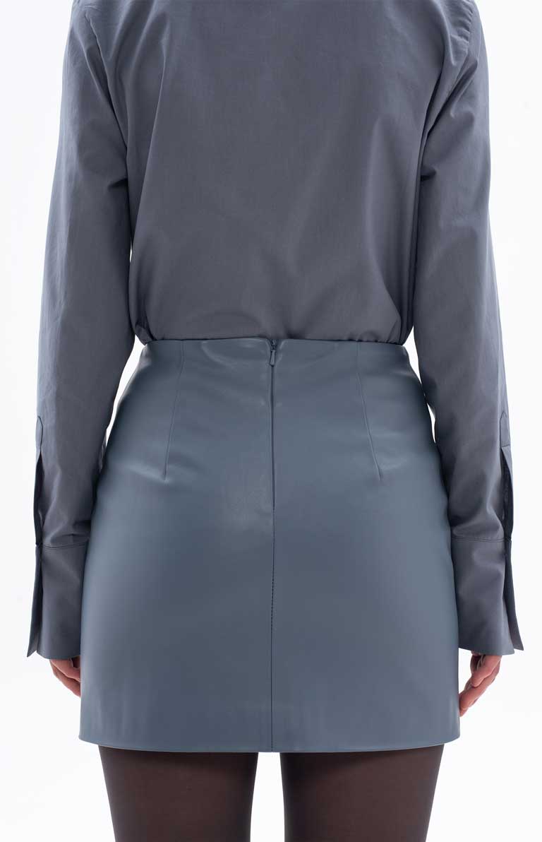 VERTIGO high-waisted mini skirt made from a carefully-selected eco-leather fabric in a pastel blue shade. Brought to life as a styling alternative to our Pastel Blue Eco-Leather Trousers, this mini skirt is an integrated part of VERTIGO's Pastel Blue Suit, consisting of the bottom part - trousers or skirt, cotton Corporate Shirt, Pastel Blue Shawl Jacket and/or Trench Coat. It's designed in a simple, slim silhouette with flattering seams on the back-side and a concealable zip-closure. A perfect piece to wear during favourite activities: strolling around town, heading to a party or a date. Finish the look with a Pastel Blue Beret or Bucket hat made of eco-leather fabric.
