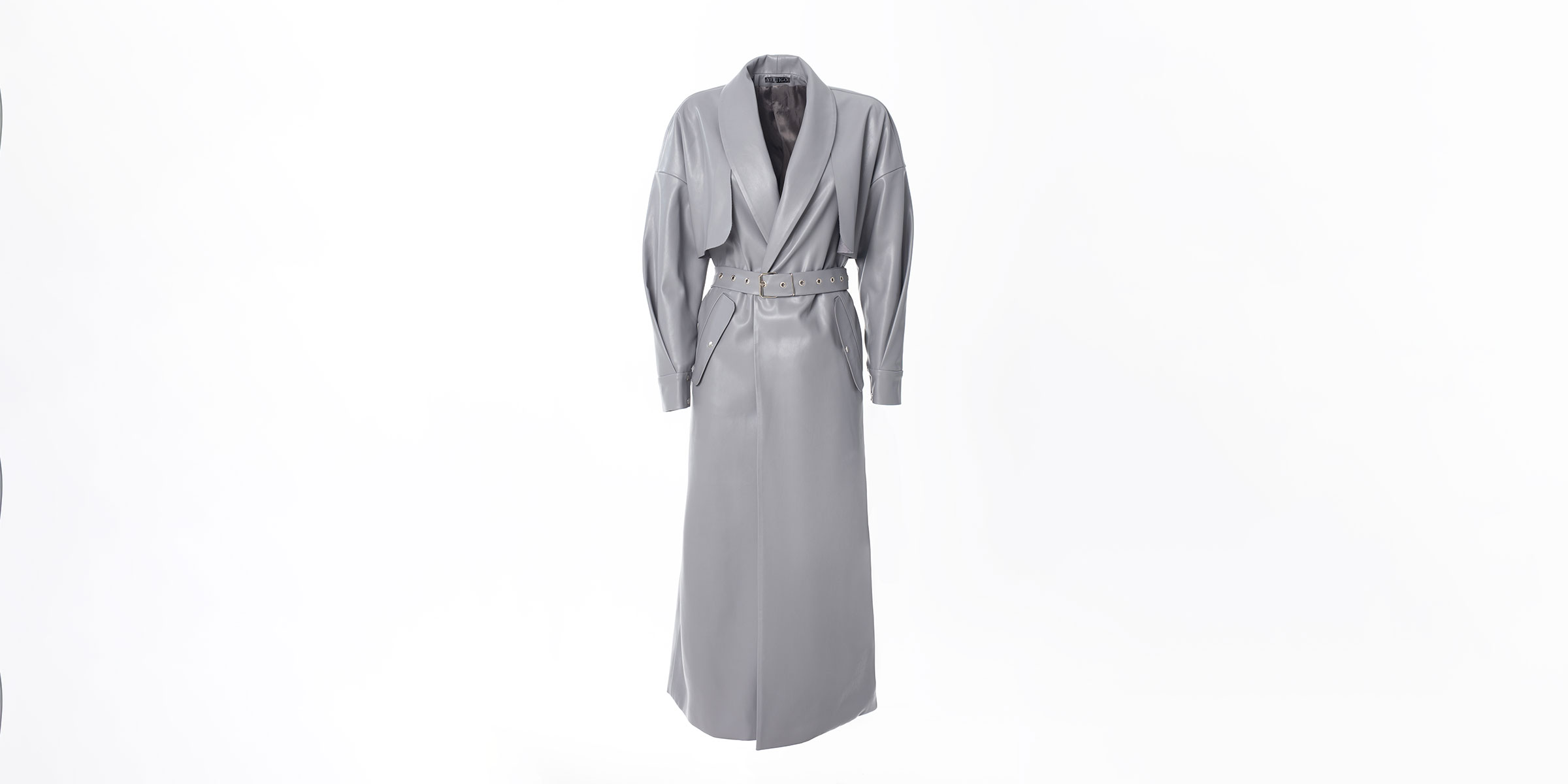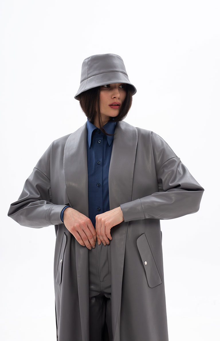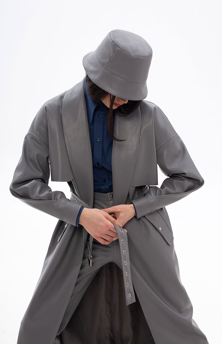 Modern trench coat crafted from eco-leather with an oversized silhouette. The collar is designed with a shawl shape and the waist is accompanied with a leather belt for styling versatility. The sleeves are designed with a fold sewn at the wrists to add volume and sophisticated draping on the sides.