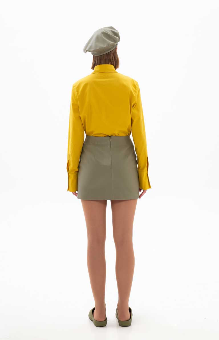 VERTIGO high-waisted mini skirt made from a carefully-selected eco-leather fabric in a Pastel Green shade. Brought to life as a styling alternative to our Pastel Green Eco-Leather Trousers, this mini skirt is an integrated part of VERTIGO's Pastel Green Suit, consisting of the bottom part - trousers or skirt, cotton Corporate Shirt, Pastel Green Shawl Jacket and/or Trench Coat. It's designed in a simple, slim silhouette with flattering seams on the back-side and a concealable zip-closure. A perfect piece to wear during favourite activities: strolling around town, heading to a party or a date. Finish the look with a Pastel Green Beret or Bucket hat made of eco-leather fabric.