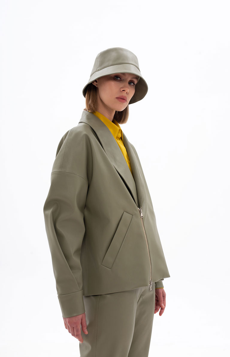 The Pastel Green Eco Jacket features a classic silhouette, crafted 100% from eco-leather. The Jacket is designed with a half zip at the front with a branded zipper puller and welt pockets. The shawl-shaped collar gives this jacket a classic yet modern look. The sleeves are designed with a fold sewn at the wrists to add volume and sophisticated draping on the sides.
